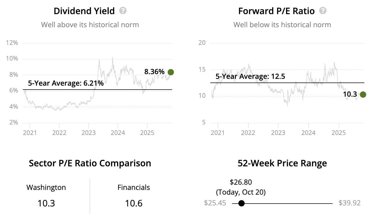 With a dividend yield north of 8% that has some support behind it, a conservative lending approach, and steady fee revenue from wealth management operations, Washington Trust offers potential for income-focused investors who can stomach short-term volatility and believe in a longer-term margin recovery.