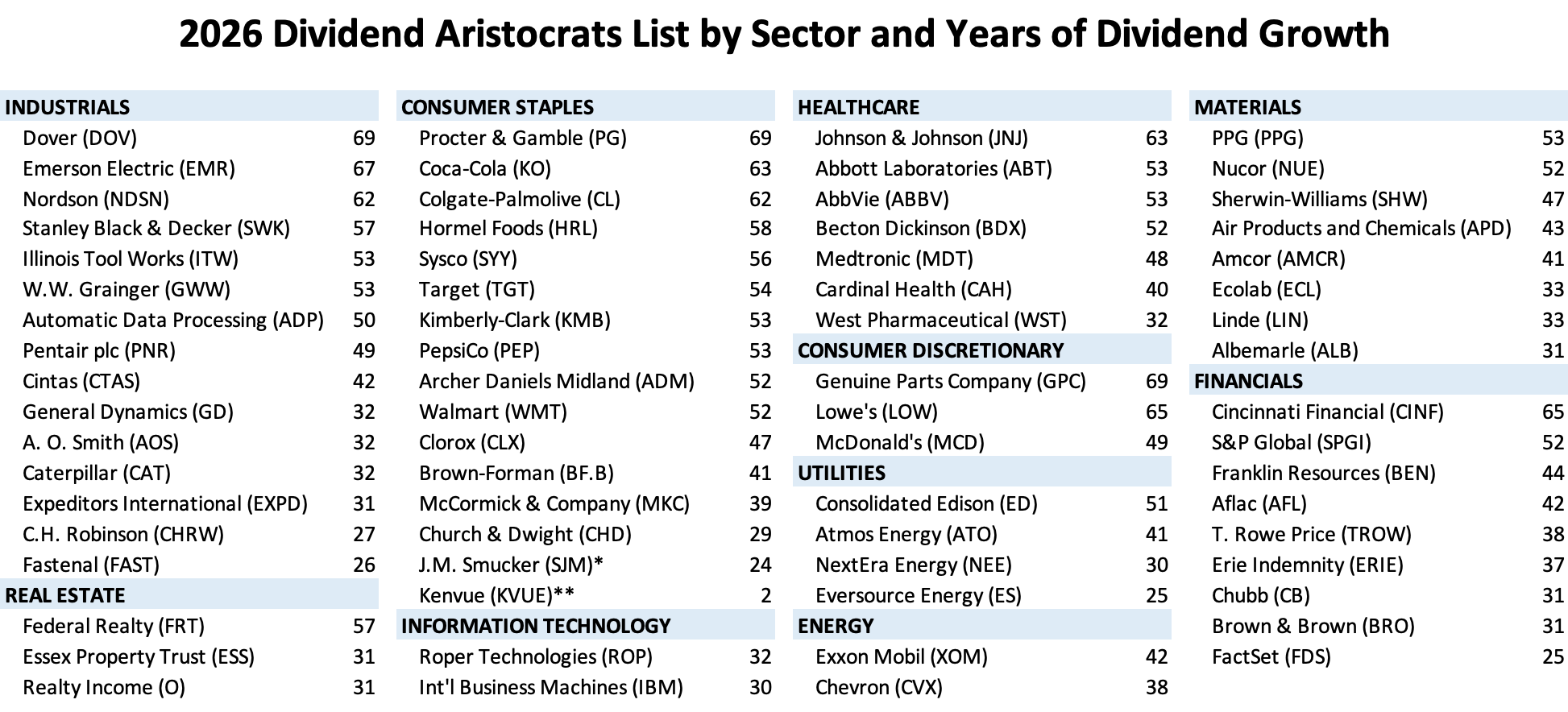 ** Note: S&P added Kenvue to the dividend aristocrats index in August 2023 after the consumer healthcare firm was spun off by Johnson & Johnson. Kenvue was given credit for J&J's dividend growth streak.