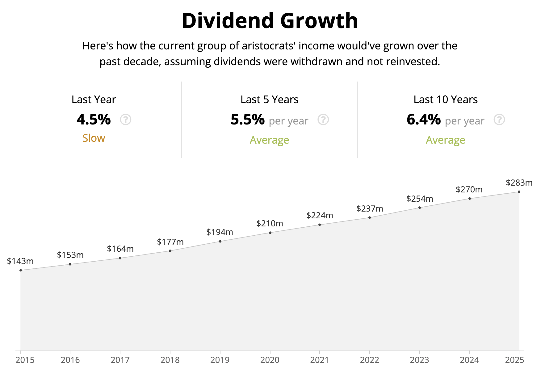 But what aristocrats lack in excitement they make up for with consistency. The group has delivered steady annual dividend growth of 6% over the last decade.