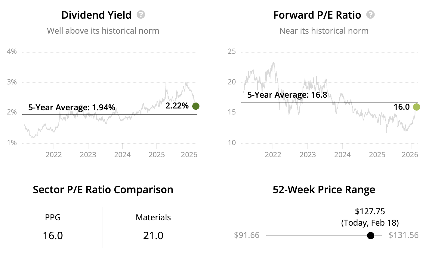 PPG, founded in 1883, manufactures paints and coatings used in industrial, automotive, aerospace, packaging, and architectural applications. Its products protect surfaces, improve durability, and enhance appearance, with demand tied to manufacturing activity and renovation cycles.