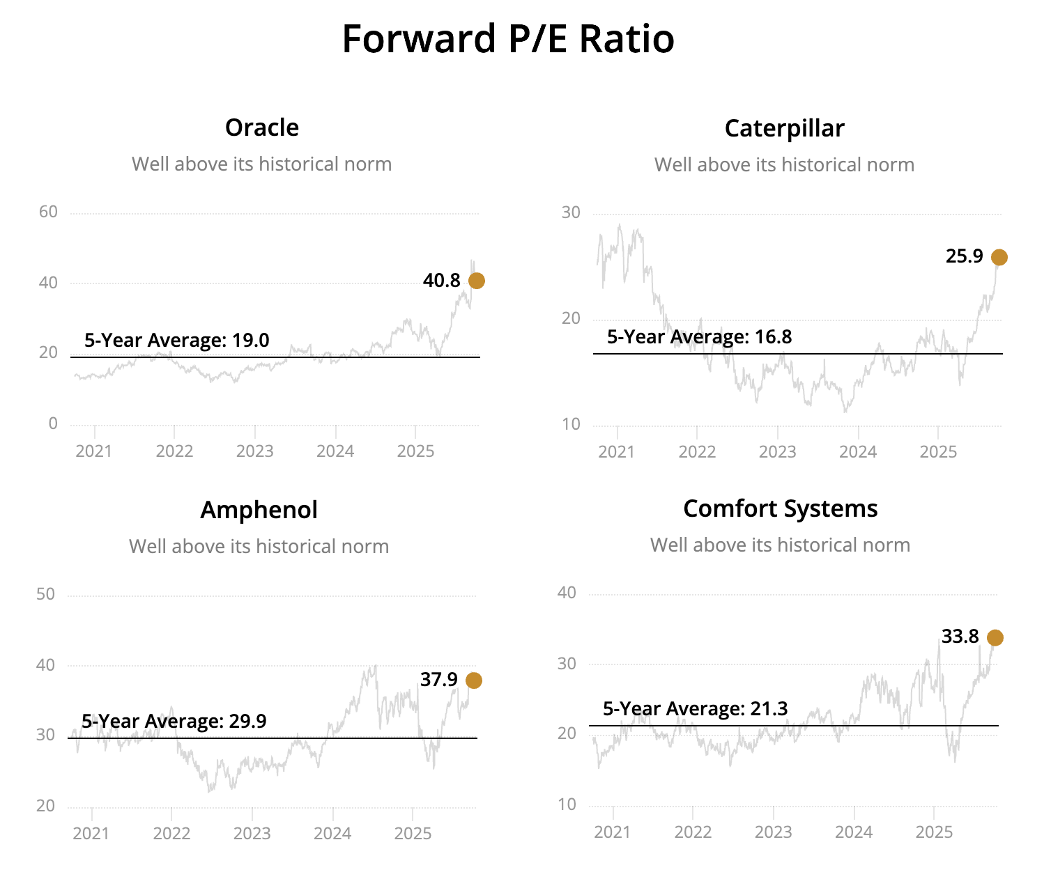 I'm no AI expert, but the current environment makes me uneasy. From cloud giant Oracle to companies supplying the picks and shovels of data center expansion like Caterpillar, Amphenol, and Comfort Systems, stock valuations have raced well ahead of their historical norms. Capital spending is surging, driven more by a fear of missing out than by clear evidence of durable returns. This is a trend that may prove unsustainable in the years ahead.