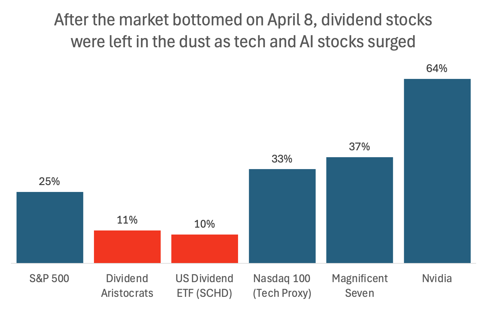 Most dividend strategies, known for their steady cash flow and lower volatility, didn't keep up in this risk-on environment. The dividend aristocrats and the popular dividend ETF SCHD returned around 10%, less than half the S&P 500's gain from its April low.