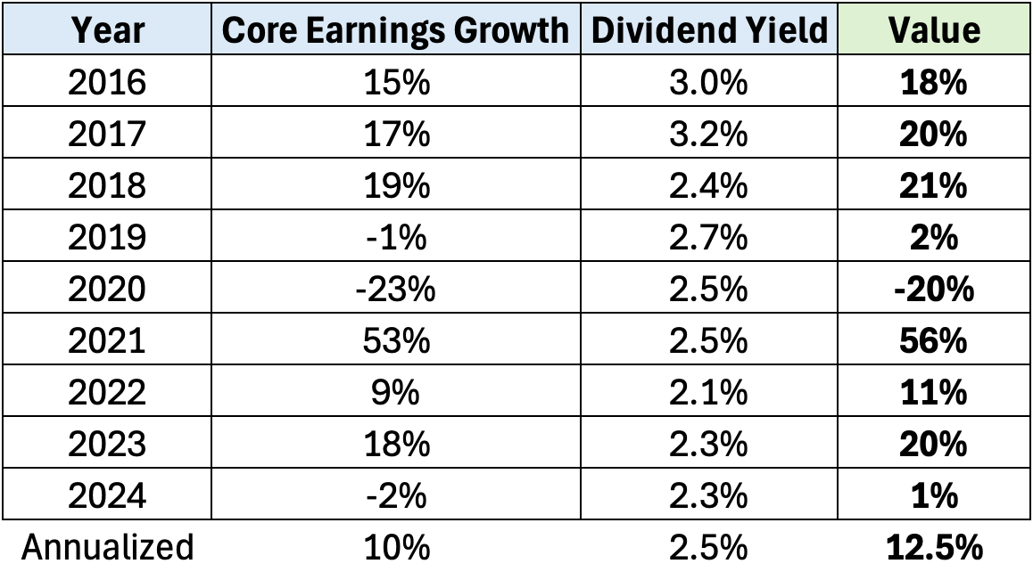 While results were lumpy, especially in 2020 when indoor dining shut down, it's reasonable to estimate that McDonald's underlying value compounded at around 12.5% annually over this period. This was driven by 10% annualized growth in core earnings plus an average dividend yield of 2.5%.